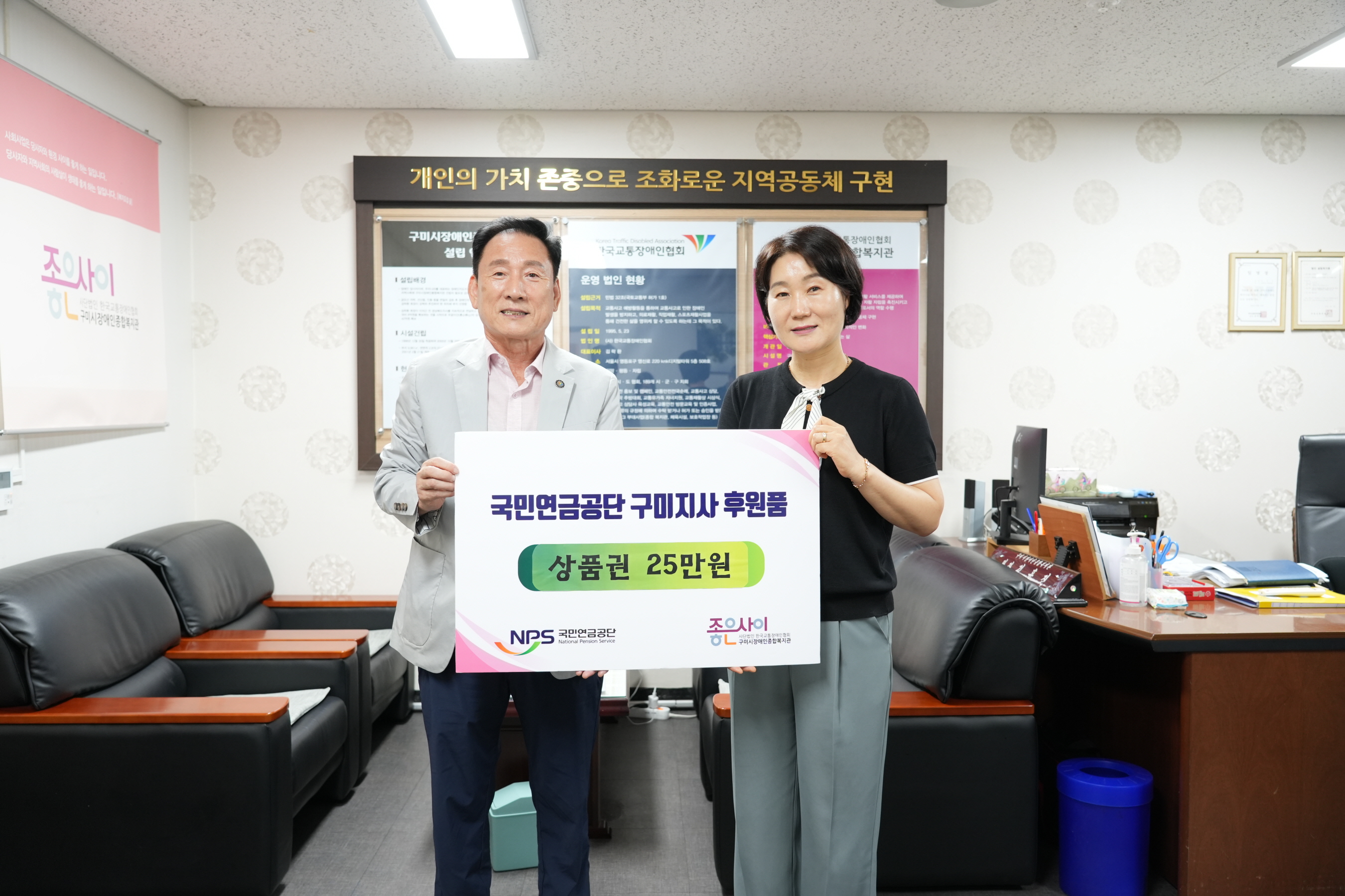 전달식은 구미시장애인종합복지관 관장실에서 진행됐으며, 국민연금공단 구미지사 최복효 지사장이 직접 방문해 나눔의 의미를 더했다.