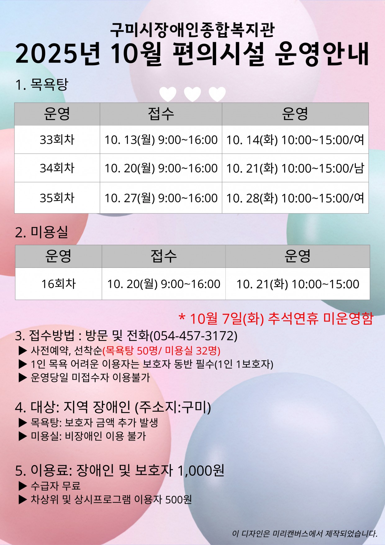 25년 10월 편의시설(목욕/미용) 운영안내 김지희 0 101 0 0 09.22 10:35 25년 10월 편의시설(목욕/미용) 운영안내* 10월 7일(화)은 추석연휴로 편의시설을 운영하지 않습니다. 0 0