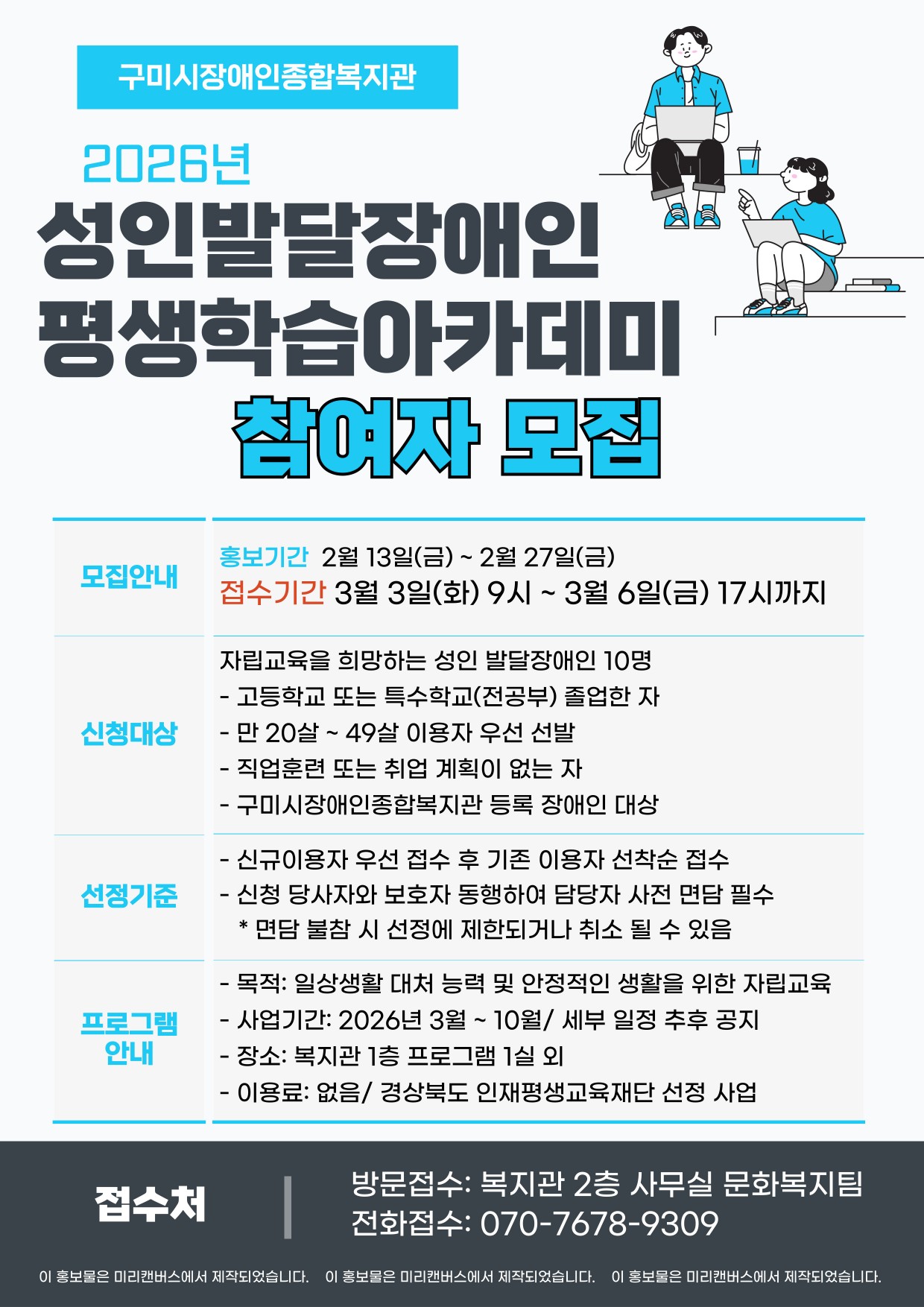 성인발달장애인 평생학습아카데미 참여자 모집 안내 문화복지팀 0 36 0 0 02.13 14:47 성인발달장애인 평생학습아카데미 참여자 모집합니다.홍보기간과 접수기간 별도입니다. 확인 부탁드립니다. 0 0