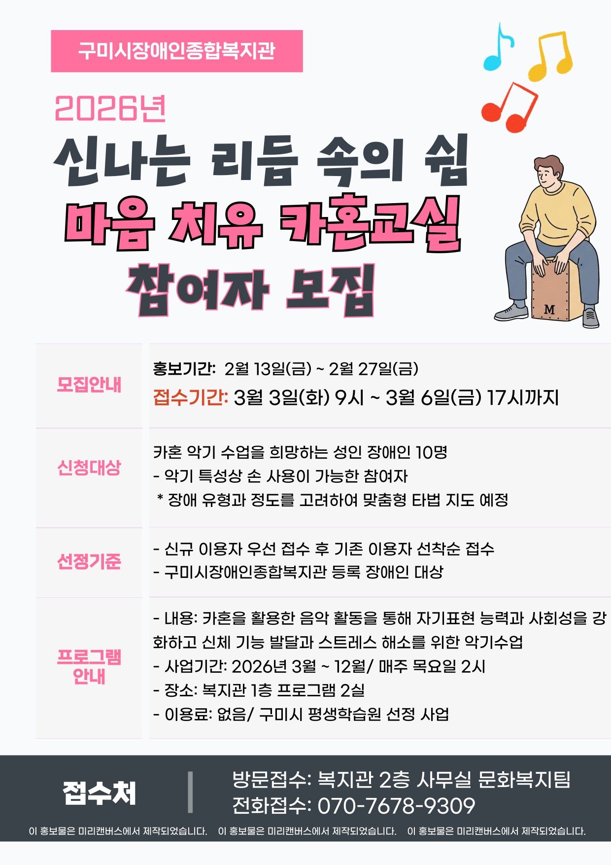 마음치유 카혼교실 참여자 모집 안내 문화복지팀 0 37 0 0 02.13 14:49 신나는 리듬속의 쉼 <마음치유 카혼교실> 참여자 모집합니다.홍보기간과 접수기간 별도입니다. 확인 부탁드립니다. 0 0
