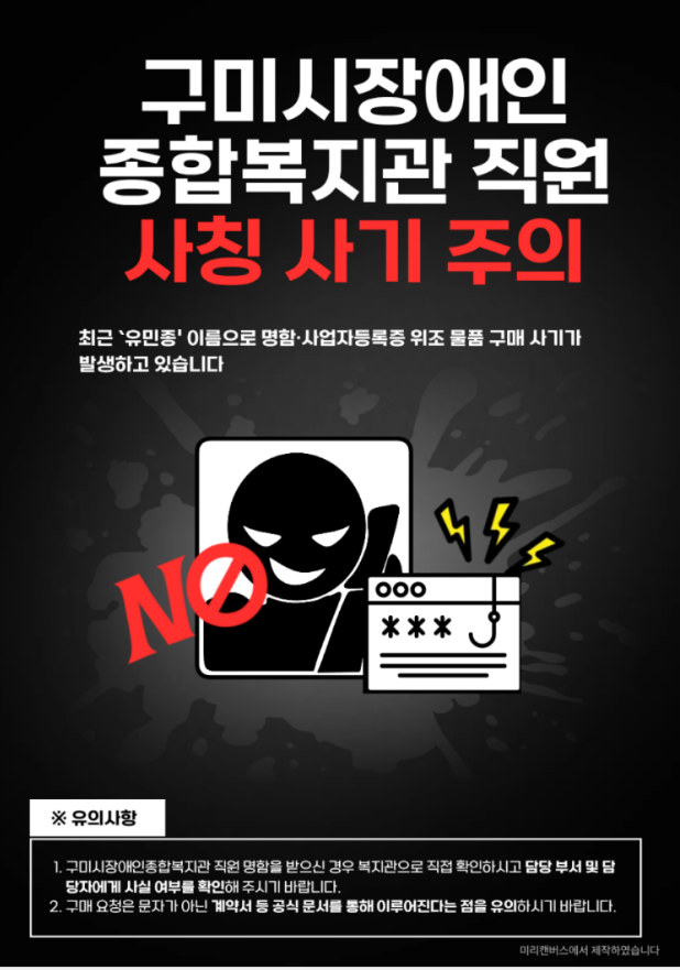구미시장애인종합복지관 직원(유민종, 김지호 등) 사칭 사기 주의 운영지원부 0 77 0 0 02.25 11:20 구미시장애인종합복지관 직원으로 사칭하여 물건납품 조건으로 계약금 선입금을 요청 하는 등 복지관 직원 사칭 사기가 많이 발생하고 있습니다.복지관의 경우 그 어떠한 선입금도 요청하지 않습니다..업체 등 관계자분들께서는 혹여 연락을 받으신다면 ★반드시 복지관 연락처를 확인하여 직접 전화하시거나 방문하여 확인해 주시기를 바랍니다ㅜㅜ반드시 직접 확인하시고 피해사례가 발생하지 않도록 당부드립니다 0 0