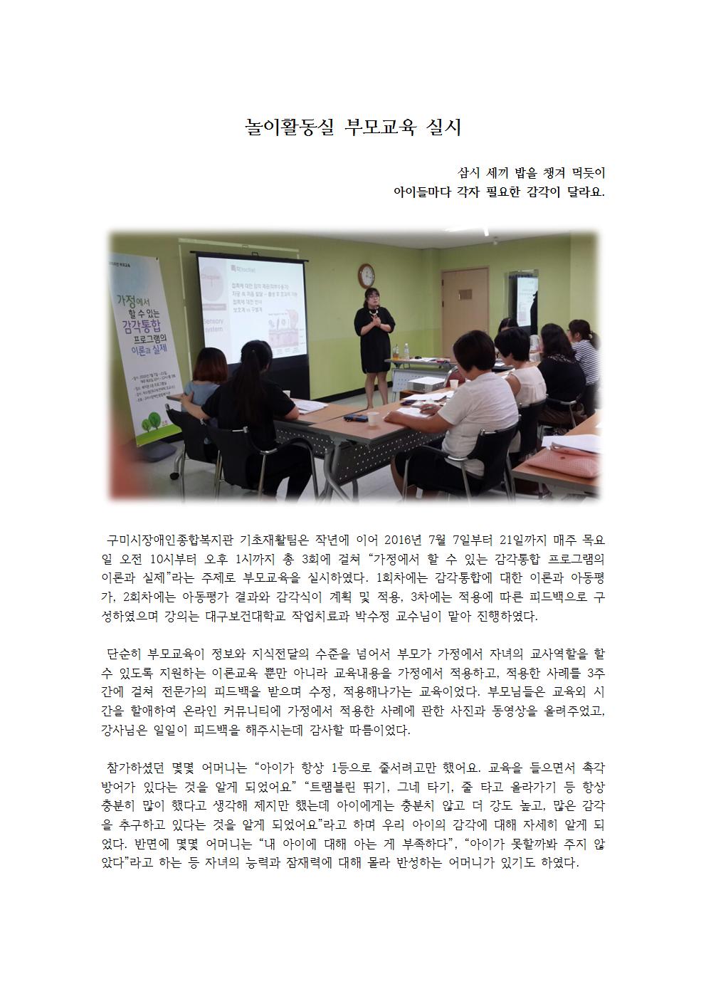 놀이활동실에서는 "가정에서 할 수 있는 감각통합 프로그램의 이론과 실제"이라는 주제로 부모교육을 실시하였습니다.
