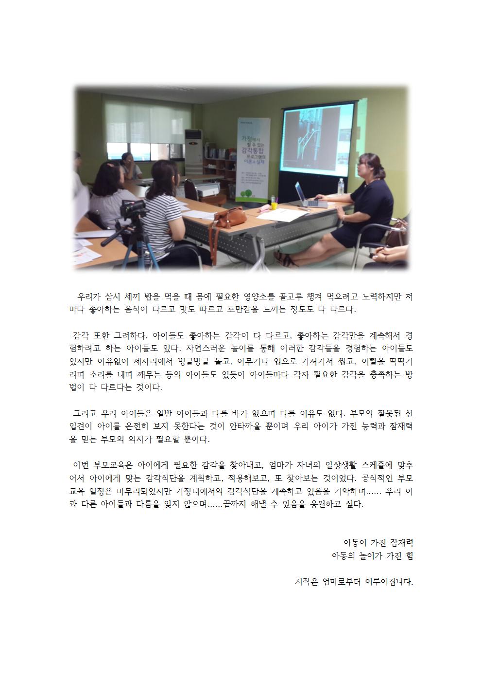 참여하신 부모님들이 이번 교육을 통해 우리아이의 감각에 대한 많이 알고, 감각식이활동을 가정에서 적용해보는 시간을 가짐으로 써 아이에 대해 조금 더 이해하는 시간을 된 것 같습니다.
