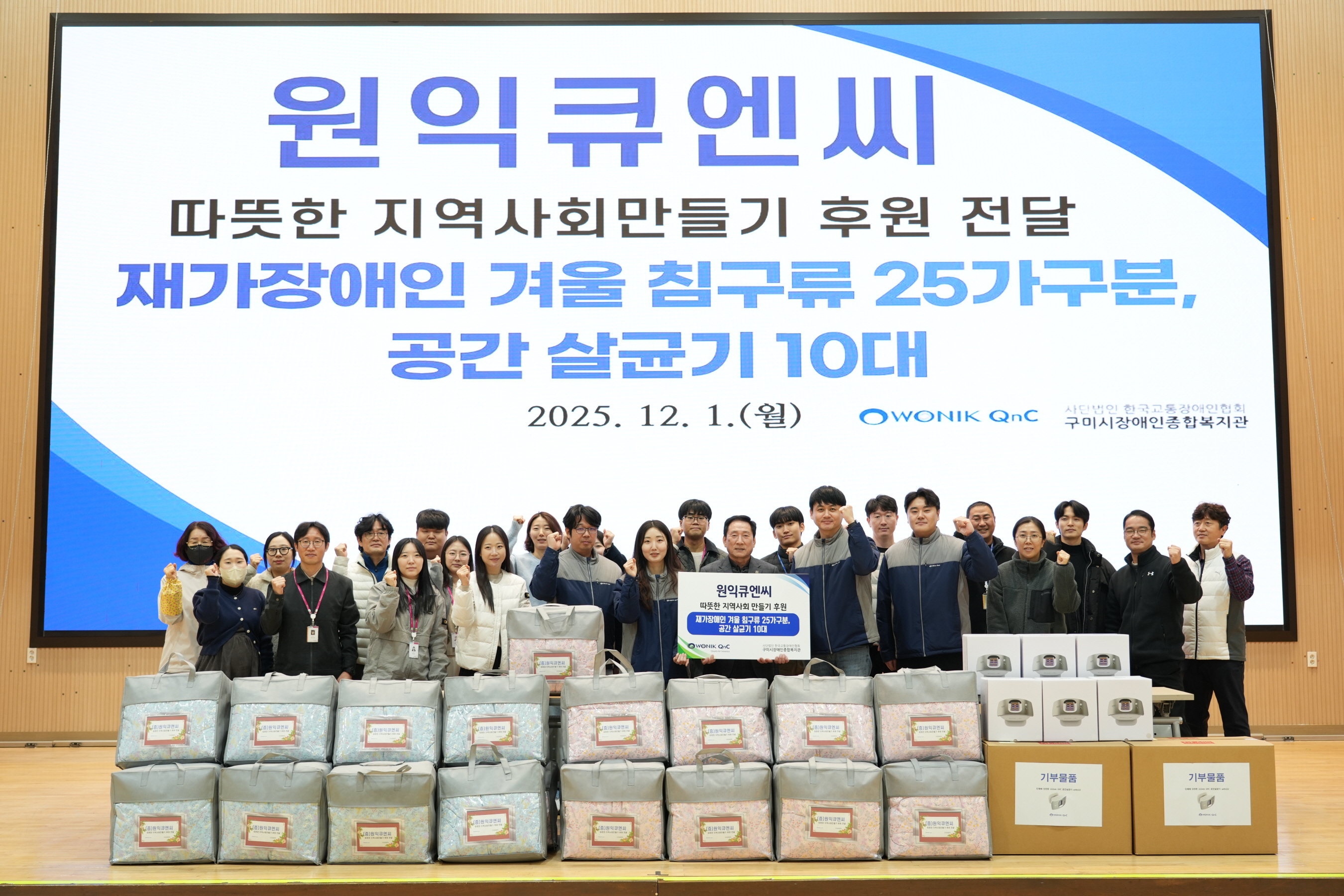원익큐엔씨(대표 백홍주)는 12월 1일 구미시장애인종합복지관(관장 김휴진)에 후원금 1,750,000원과 7,000,000원 상당의 자외선 살균기 10대(1대당 70만 원)를 전달했다. 전달된 후원금은 재가장애인 25가정에 겨울 이불을 지원하는 데 사용될 예정이다.